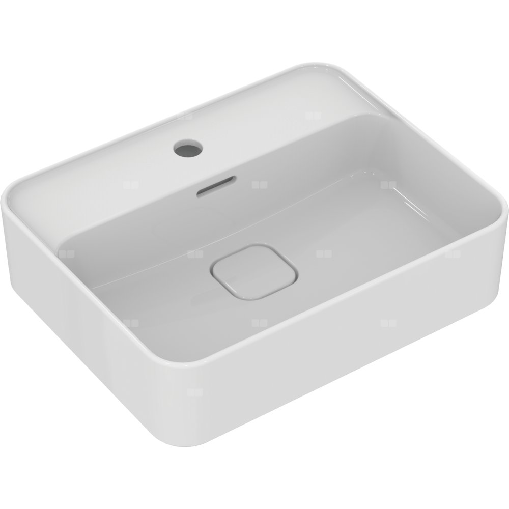 Umywalka Strada II z centralnie wybitym otworem na baterię, ze szczelinowym przelewem i korkiem o białej pokrywie. W komplecie zestaw montażowy i szablon do wycinania. Opcjonalny montaż z korkiem typu Click-clack z metalową pokrywą T3629AA.
