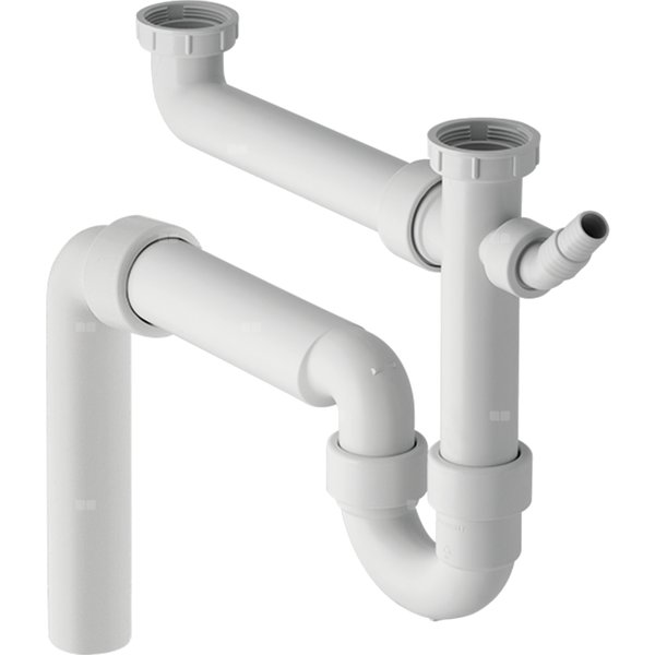 Syfon rurowy Geberit do dwóch zlewozmywaków, z łącznikiem kątowym wężyka, wylot pionowy: d=50mm, G=1 1/2″, Biały-alpin