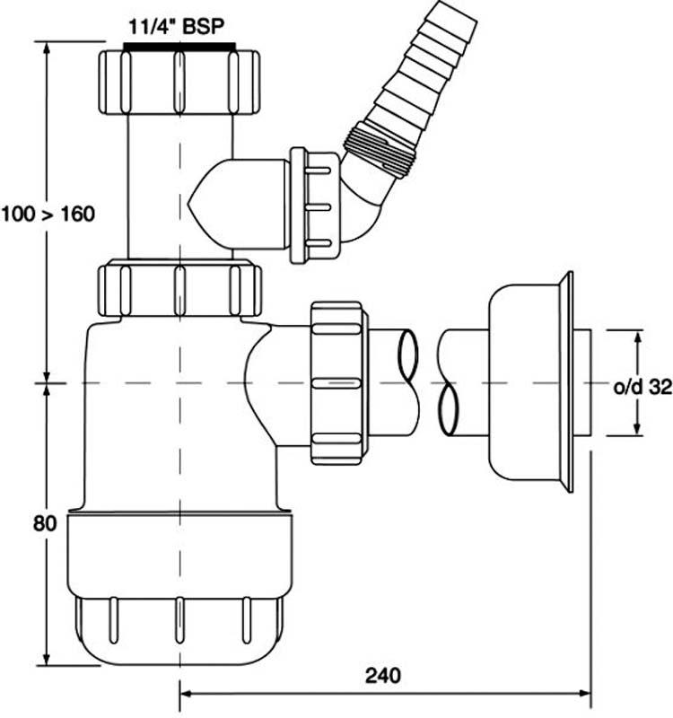 Syfon umywalkowy butelkowy "niski" 11/4"x32mm z podłączeniem pralki lub zmywarki bez spustu