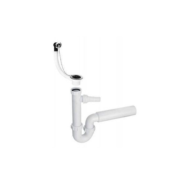 Syfon zlewozmywakowy rurowy z podłączeniem do pralki lub zmywarki z odejściem poziomym 50mm, spustem 1.1/2″x70mm i przelewem okrągłym. Przepustowość 39 l/min. przy słupie wody 120mm.