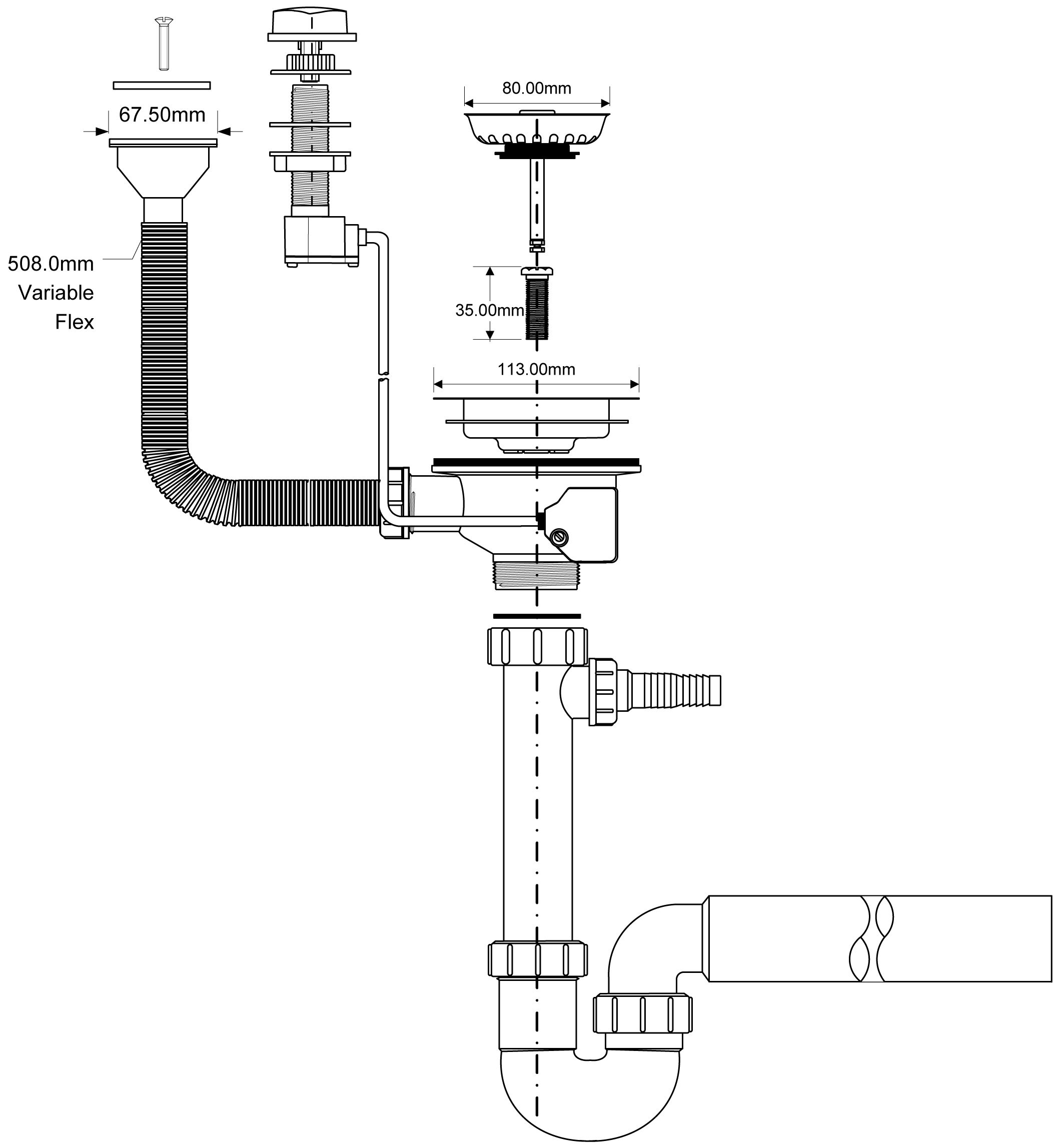 Syfon zlewozmywakowy rurowy 1.1/2″x50mm z podłączeniem do pralki lub zmywarki i odejściem poziomym 50mm. Spust 1.1/2″x113mm z korkiem automatycznym i przelewem z podłączeniem horyzontalnym do ociekacza.