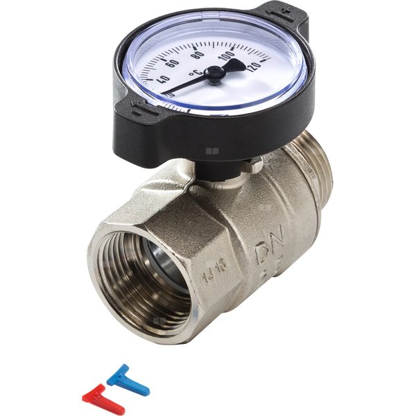 Zawór kulowy z termometrem w pokrętle, niklowany, z czerwonymi i niebieskimi klipsami do zaznaczenia zasilania i powrotu.