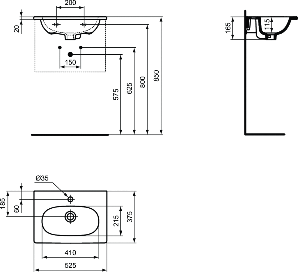 Umywalka Tesi 50 cm z powierzchniami bocznymi - krótki wysięg - 1 otwór na baterię.