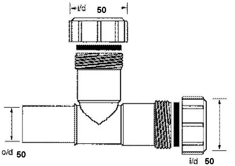 Trójnik nakrętno-prosty. Rozmiar 50x50x50mm.
