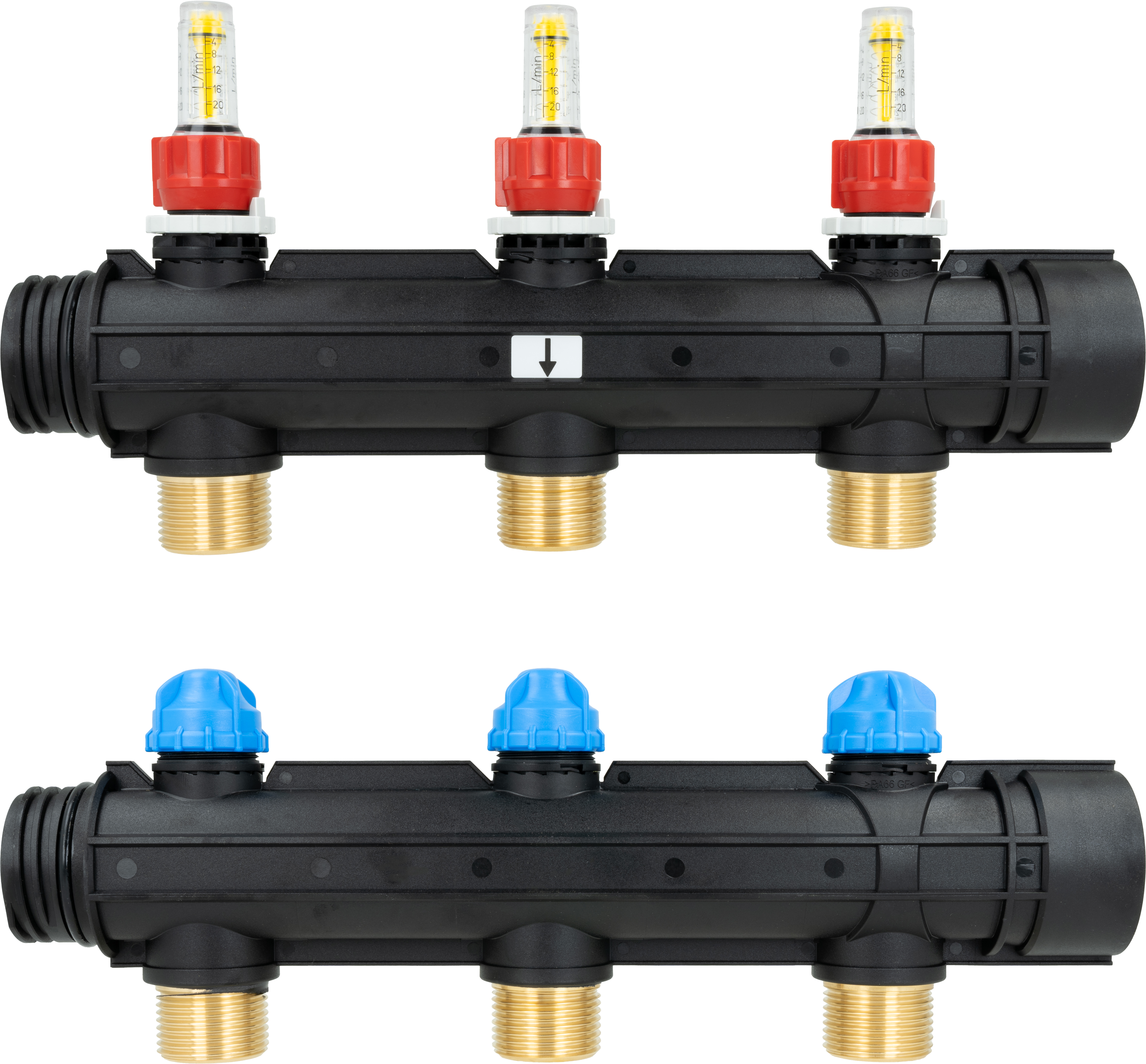Trzy obiegi rozdzielacza ProCalida IN 1 1/2'', rozstaw 100 mm, G1'', rotametry 4÷20 l/min