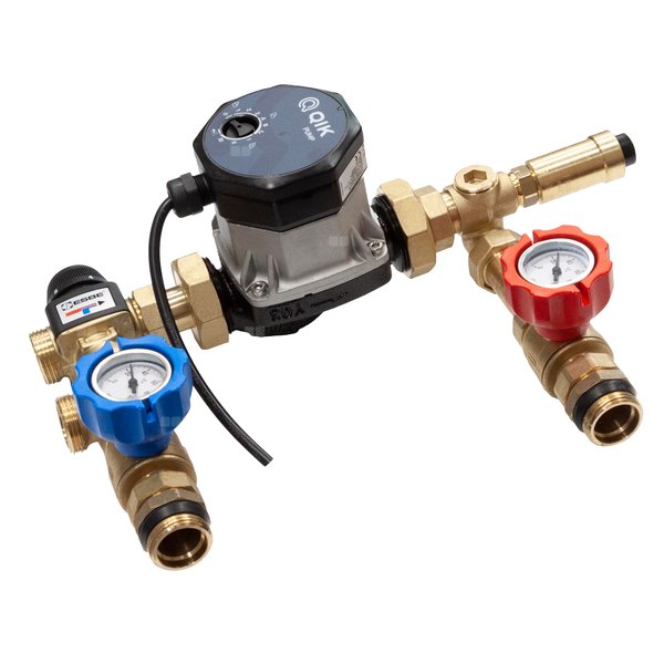 Grupa pompowo-mieszająca do regulacji temperatury ogrzewania podłogowego w zakresie 35-60°C z pompą QIK Kv 2,3. Wyposażenie: • pompa elektroniczna QIK 25-8/130 • termostatyczny zawór 3-drogowy ESBE • odpowietrznik automatyczny Flamco • zawór kulowy z termometrem – 2 szt. • system łączników i nypli mosiężnych do szybkiego montażu do rozdzielaczy i zasilania / powrotu