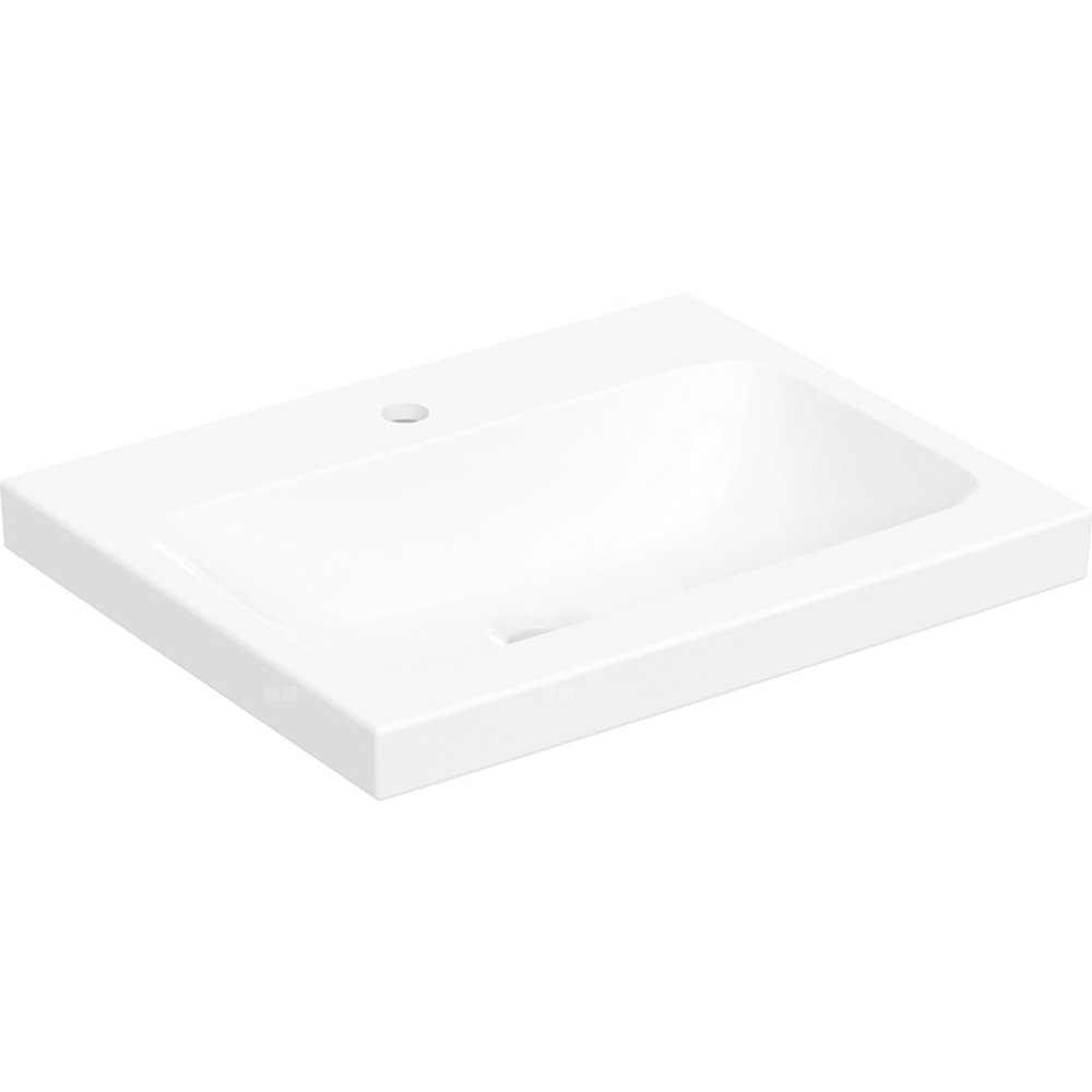 Umywalka GEBERIT iCon Light prostokątna, biała / KeraTect, 600mm, otwór na baterię na środku, stawiana na blat, bez odpływu przelewowego, półka od ściany