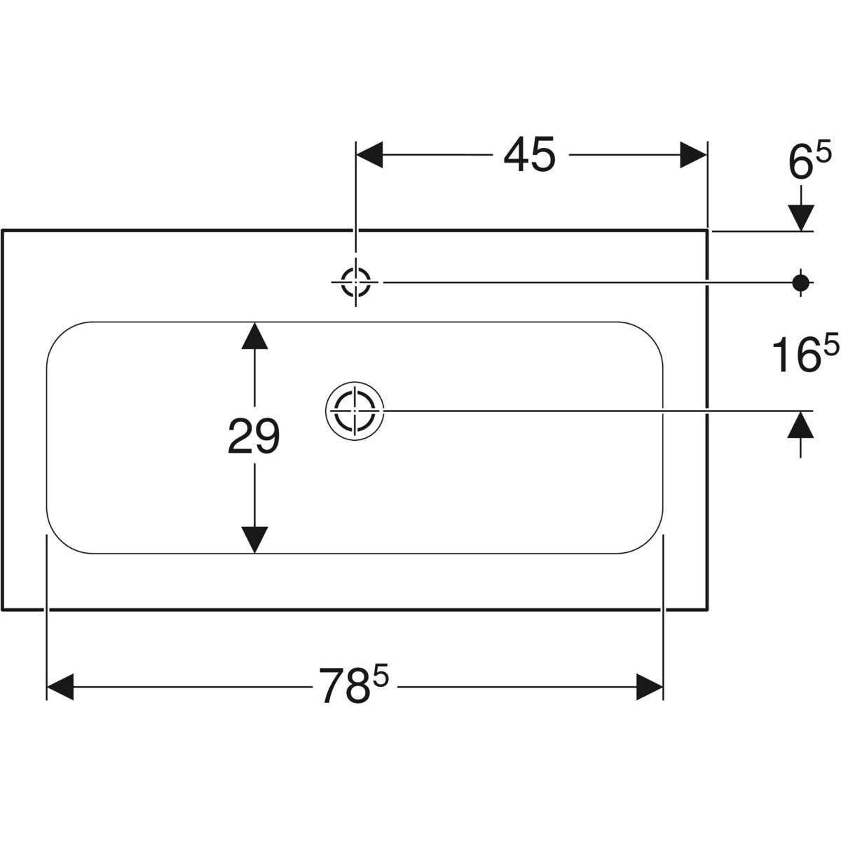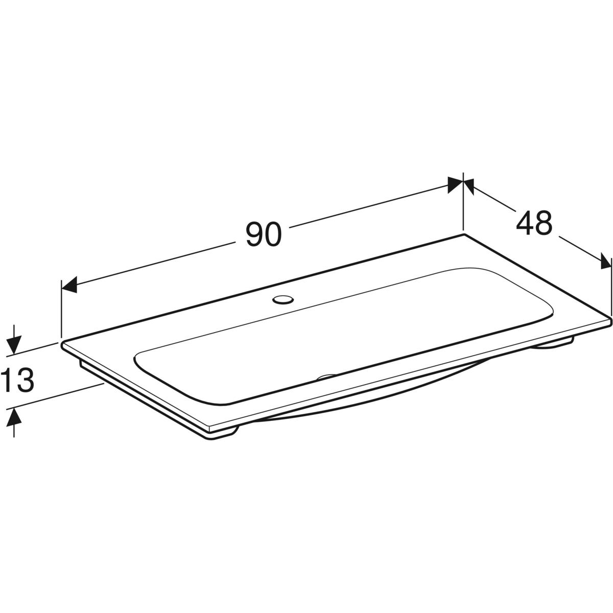 Umywalka GEBERIT iCon prostokątna, biała, 900mm, otwór na baterię na środku, nakładany od góry, bez odpływu przelewowego, półka od ściany
