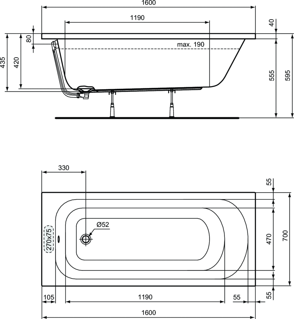 Wanna zwykła 1600x700x435 mm, bez otworu na baterię, z przelewem, bez korka spustowego - SIMPLICITY
