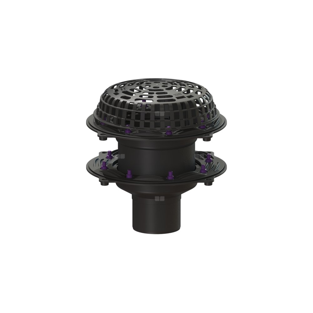 Wpust dachowy Ecoguss służy do odwodnienia punktowego i jest wyposażony w dociskowy kołnierz uszczelniający i osłonę przed żwirem. Przystosowane do recyklingu tworzywo kompozytowe Ecoguss spełnia najwyższe wymagania akustyczne, jest odporne na agresywne czynniki, odporne na temperaturę do 400°C i korozję. Dociskowy kołnierz uszczelniający z bolcami i śrubami ze stali nierdzewnej służy do dociskania lub zgrzewania taśm bitumicznych i polimerowo-bitumicznych oraz taśm uszczelniających z tworzywa sztucznego i elastomerów. Do uszczelnień wodoszczelnych mogą być stosowane tylko sprawdzone przez producenta membrany hydroizolacyjne. Wyrównanie potencjałów nie jest konieczne. Wskazówka: W przypadku dachu trapezowego o powierzchni przekraczającej 2500 metrów kwadratowych należy skonsultować się z centrum serwisowym firmy KESSEL.