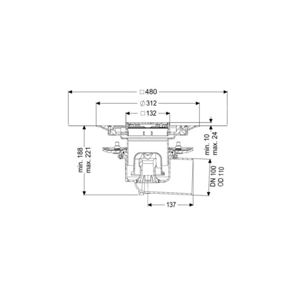 KESSEL Wpust obiek. Ecoguss doc.koł.usz., wielkość nominalna (DN) 100, dł. pokrywy 120 mm, króciec boczny, syfonem w zestawie, odwodnienie przez odpływ punktowy, maks. wys. posadzki 24 mm, typ pokrywy Kratka design, regulowany w trzech wymiarach