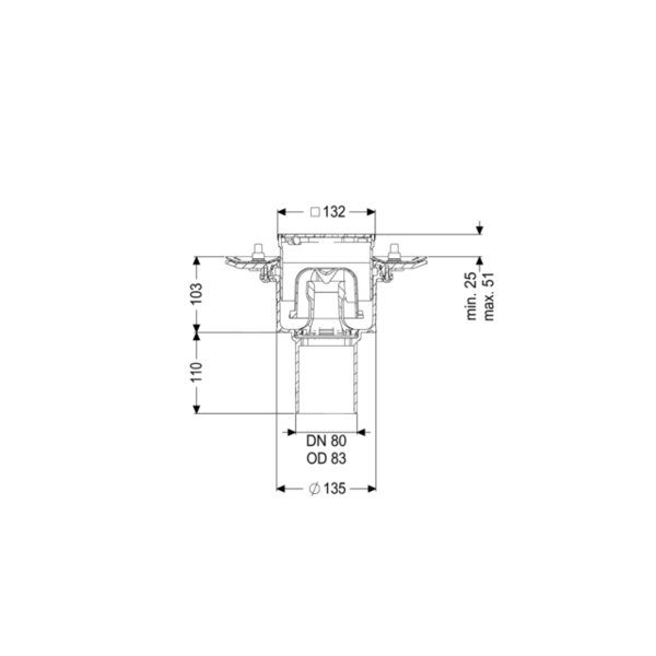 KESSEL Wpust obiek. Ecoguss doc.koł.usz., wielkość nominalna (DN) 80, dł. pokrywy 120 mm, króciec pionowy, syfonem w zestawie, odwodnienie przez odpływ punktowy, maks. wys. posadzki 16 mm, typ pokrywy Kratka design, z regulowaną wysokością
