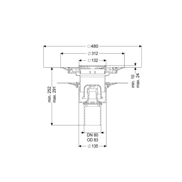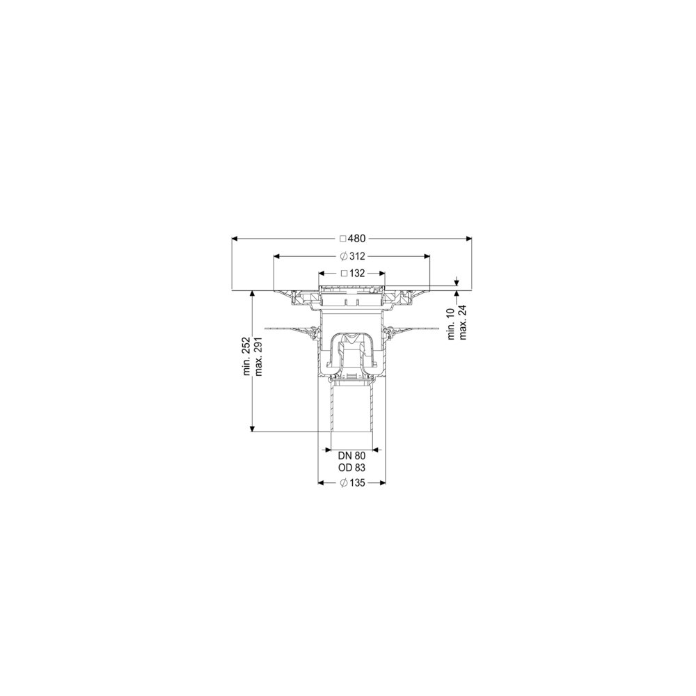 KESSEL Wpust obiektowy Ecoguss kołnier., wielkość nominalna (DN) 80, króciec pionowy, odwodnienie przez odpływ punktowy, syfonem w zestawie, maks. wys. posadzki 24 mm, typ pokrywy Kratka design, regulowany w trzech wymiarach