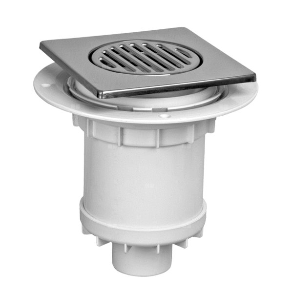 Wpust podłogowy wykonany z ABS z kwadratową kratką 150x150mm wykonaną ze stali nierdzewnej. Króciec odpływowy o średnicy 110 lub 50mm. Wysokość wpustu 130mm.