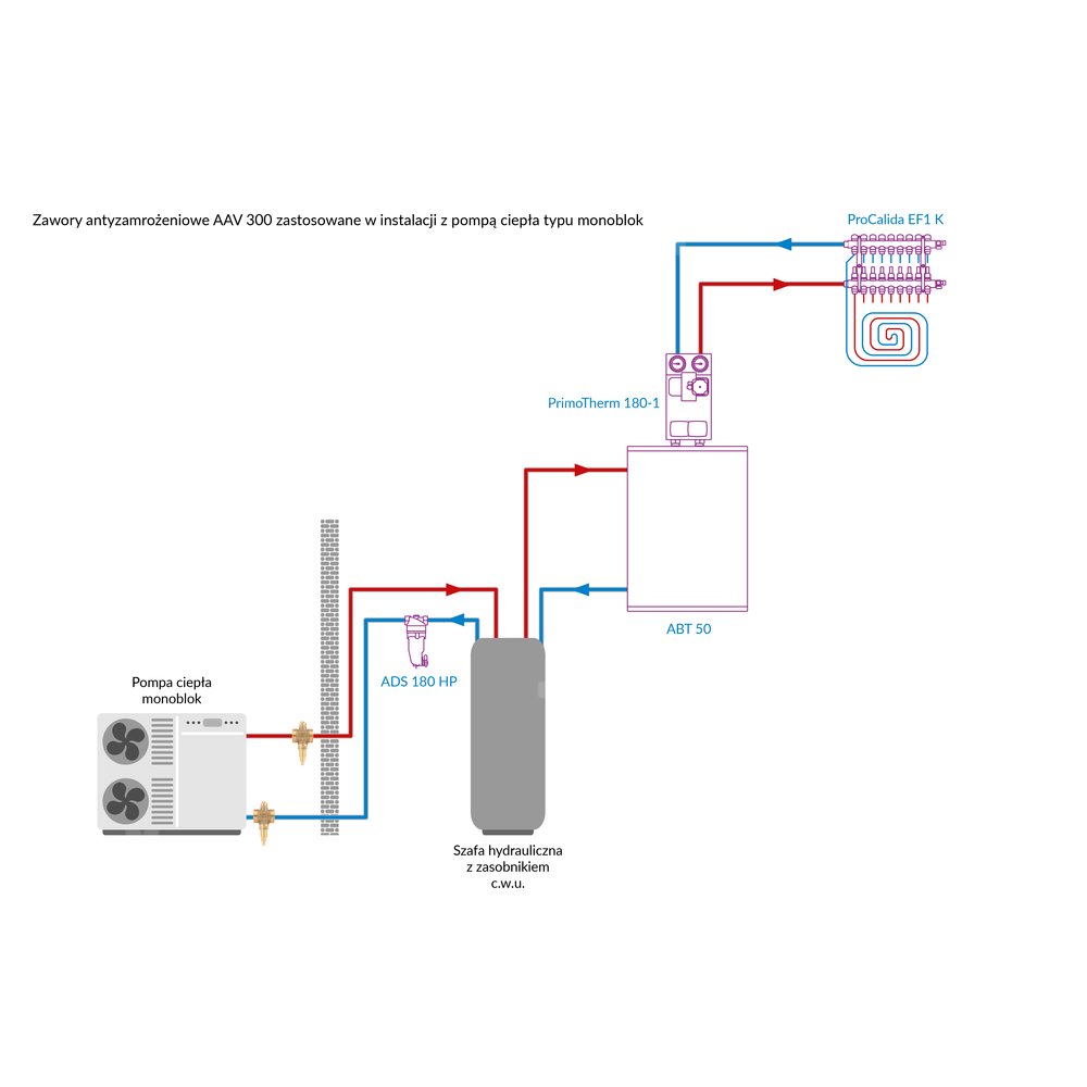 Stosowany w instalacjach grzewczych i chłodzących z powietrzną pompą ciepła typu monoblok.Montowany na rurze powrotnej i zasilającej na zewnątrz budynku, jak najbliżej jednostki zewnętrznej.