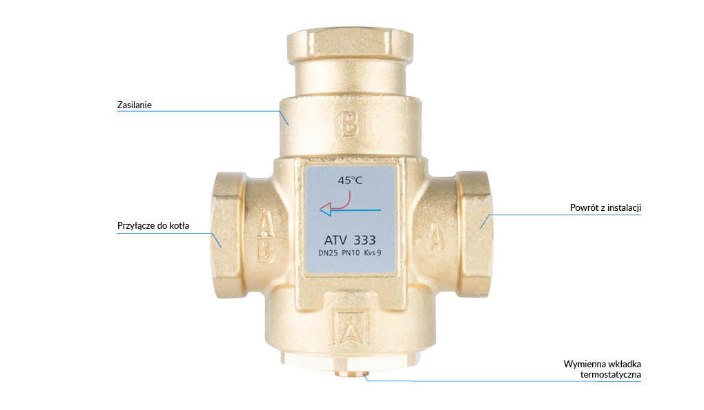 Stosowany w instalacjach grzewczych z kotłami stałopalnymi, zalecany szczególnie do instalacji z buforami ciepła.Montowany na powrocie z instalacji.