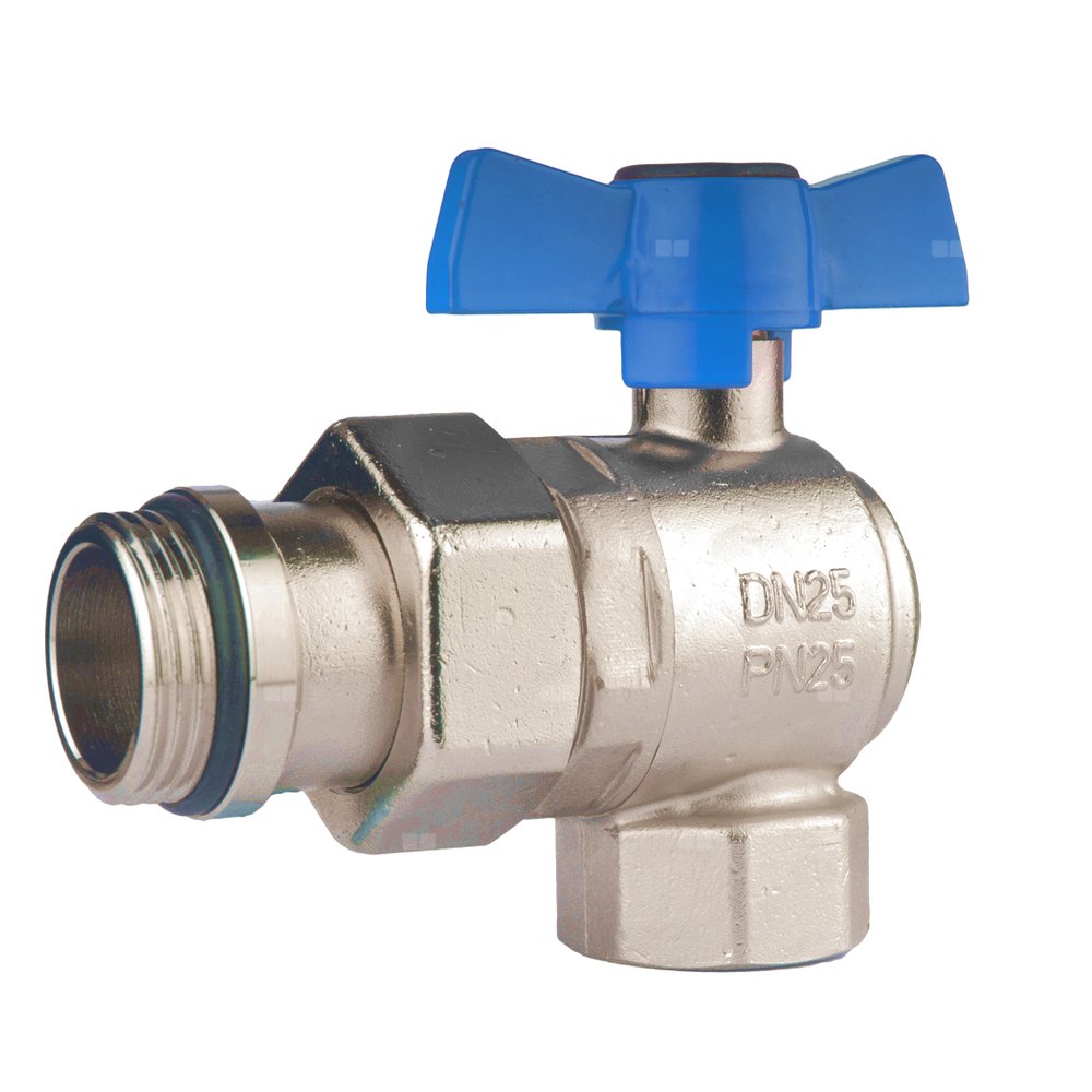 Zawór kulowy "MODUL" z pokrętłem (Silumin), mufa x półśrubunkek z samouszczelnieniem, figura kątowa, pokrętło niebieskie. Korpus z mosiądzu kutego, zgodnie z EN 12165, niklowany, uszczelki PTFE, uszczelnienie półśrubunku EPDM. Kula chromowana z pełnym przepływem. Gwint wewnętrzny zgodnie z ISO 228. Temperatura maks. 150°C.