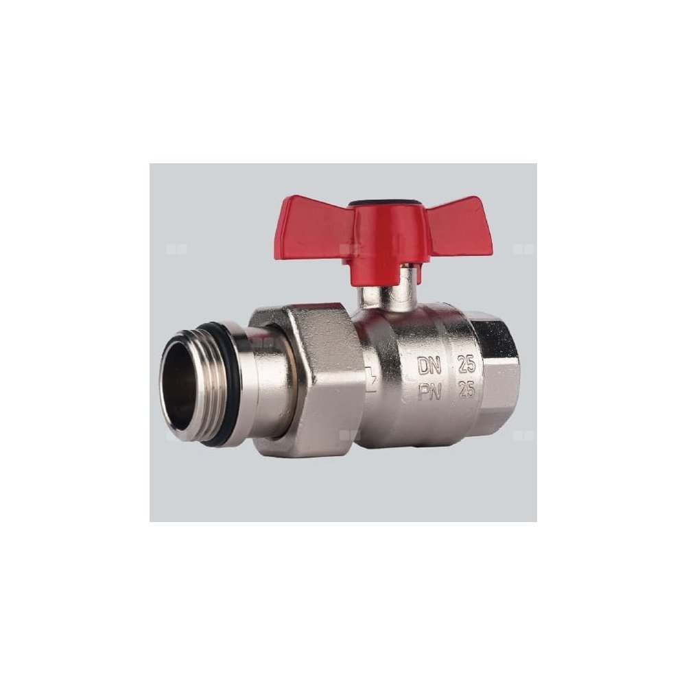 Zawór kulowy "MODUL" z pokrętłem (Silumin), mufa x półśrubunkek z samouszczelnieniem, figura prosta, pokrętło czerwone. Korpus z mosiądzu kutego, zgodnie z EN 12165, niklowany, uszczelki PTFE, uszczelnienie półśrubunku EPDM. Kula chromowana z pełnym przepływem. Gwint wewnętrzny zgodnie z ISO 228. Temperatura maks. 150°C.