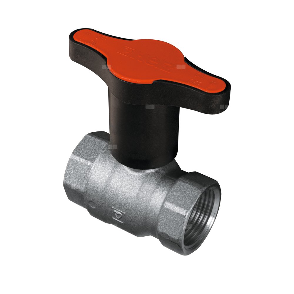 Zawór kulowy „MODUL” z pokrętłem (Silumin), PN 25, mufa x mufa. Korpus z mosiądzu kutego, zgodnie z EN 12420, niklowany, uszczelki PTFE. Kula chromowana z pełnym przepływem. Gwint wewnętrzny zgodnie z ISO 228. Zakres temperatury pracy od -30 do 150 ºC (dla wody od 0,5 do 110 ºC), do każdego rodzaju nieagresywnego medium jak woda, olej, powietrze, olej opałowy oraz olej smarowy.