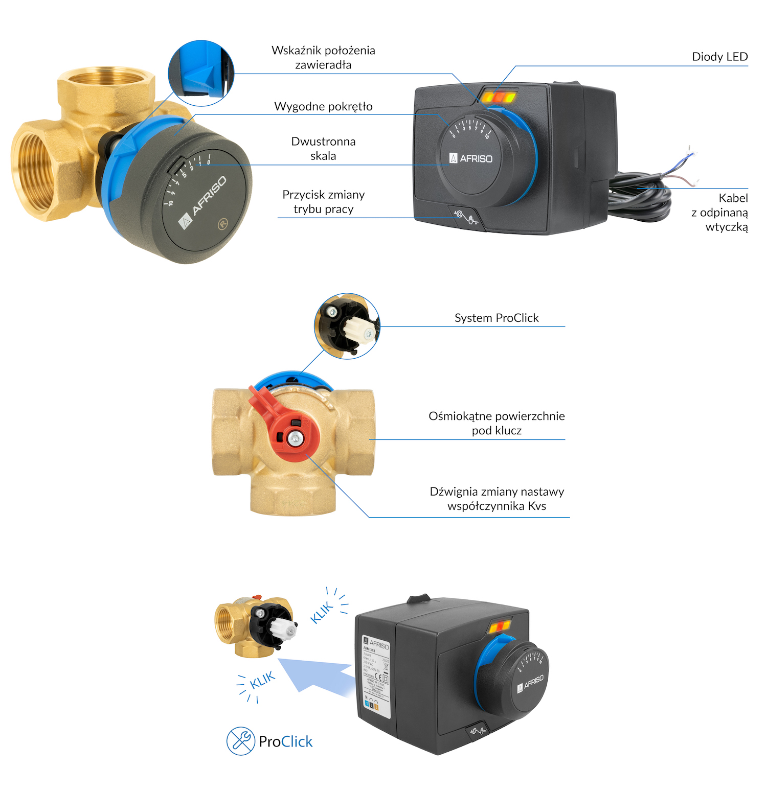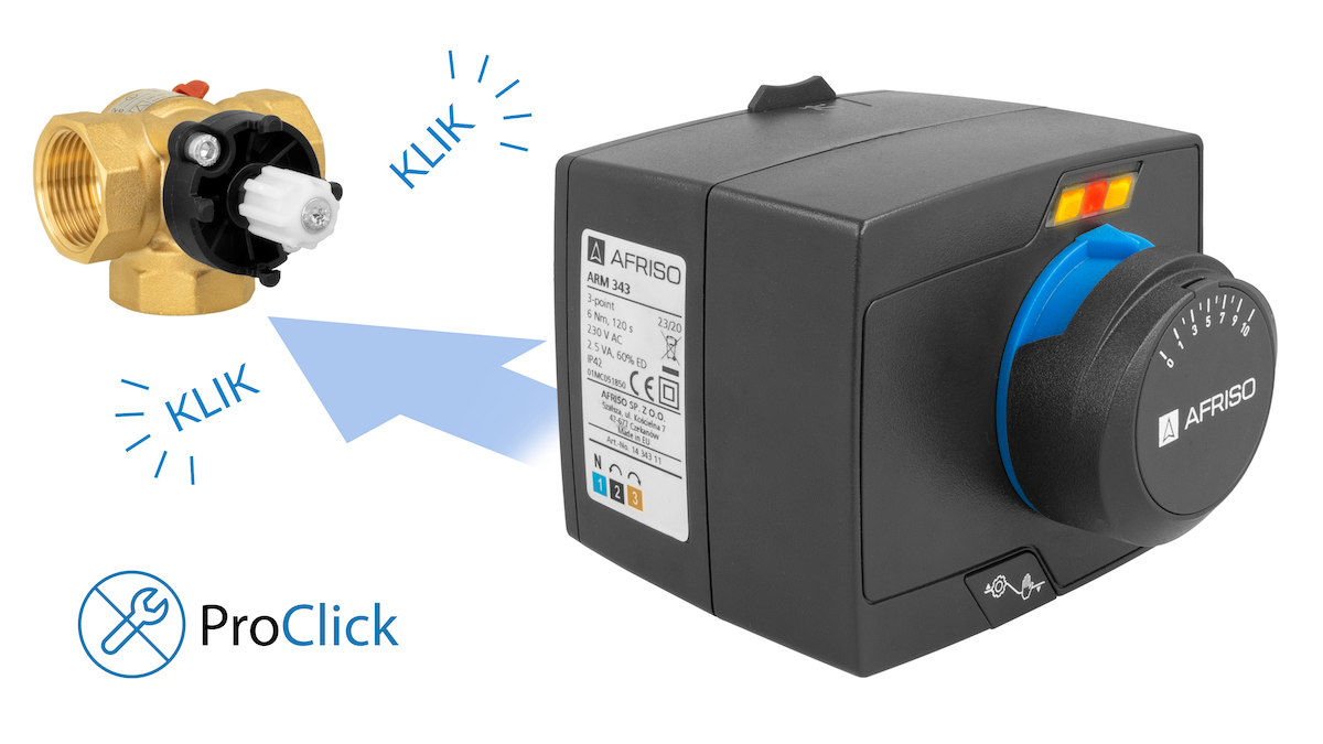 Urządzenia wyposażone w system ProClick – pozwala na bezpośredni montaż siłownika na zaworze bez użycia dodatkowych narzędzi.