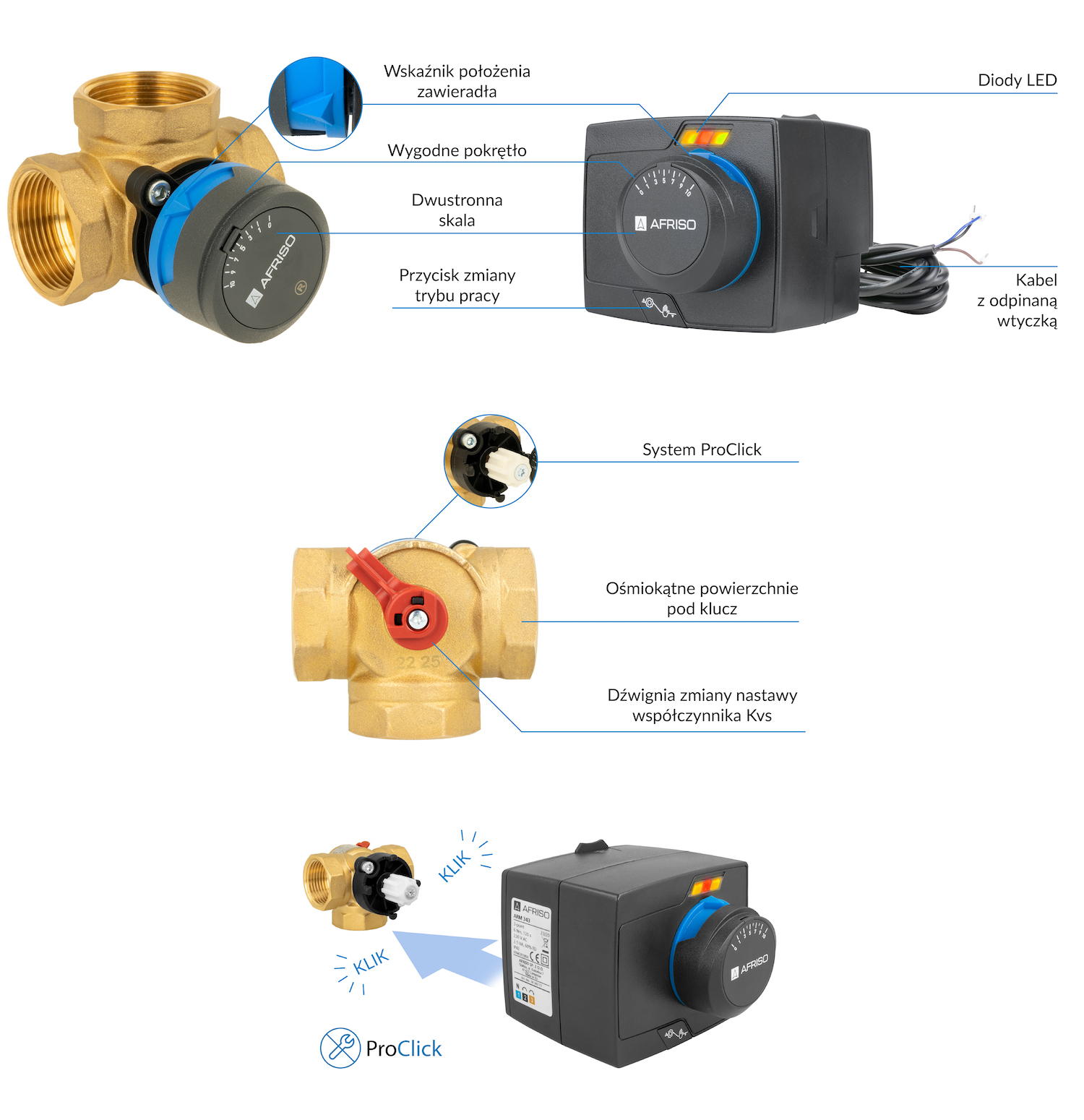 Urządzenia wyposażone w system ProClick – pozwala na bezpośredni montaż siłownika na zaworze bez użycia dodatkowych narzędzi.