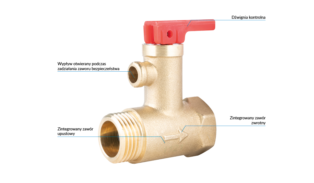 - Zawór upustowy - otwiera wypływ wody z podgrzewacza do instalacji wodnej, kiedy ciśnienie w podgrzewaczu przekracza ciśnienie na zasilaniu zimnej wody.