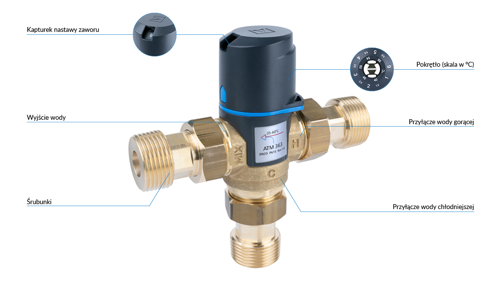 Utrzymuje za zaworem stałą, zadaną temperaturę wody.