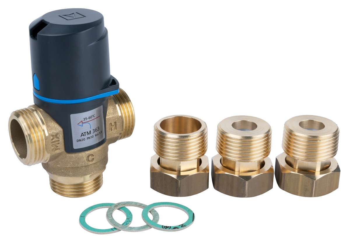 Zawór regulacyjny termostatyczny do wody ciepłej AFRISO ATM 363 ze śrubunkami mosiądz GZ 1'', DN 20, zakres temp. 35-60'C, Kvs 1.6 m3/h, maksymalna temperatura 90'C, maksymane ciśnienie 10 bar