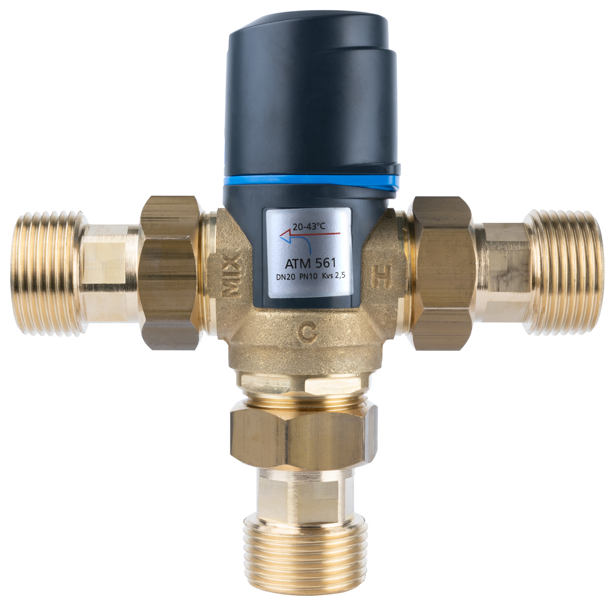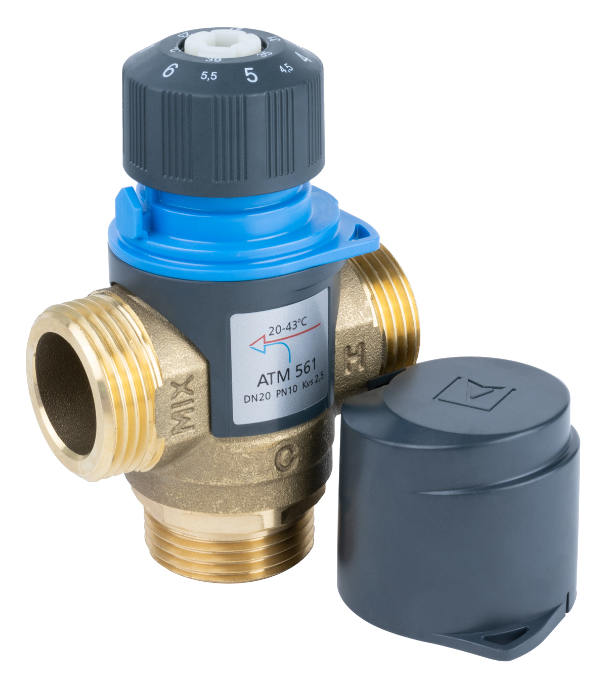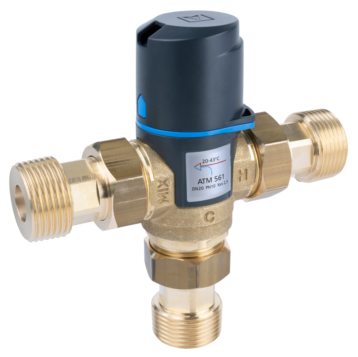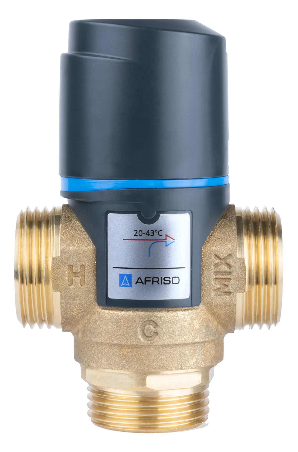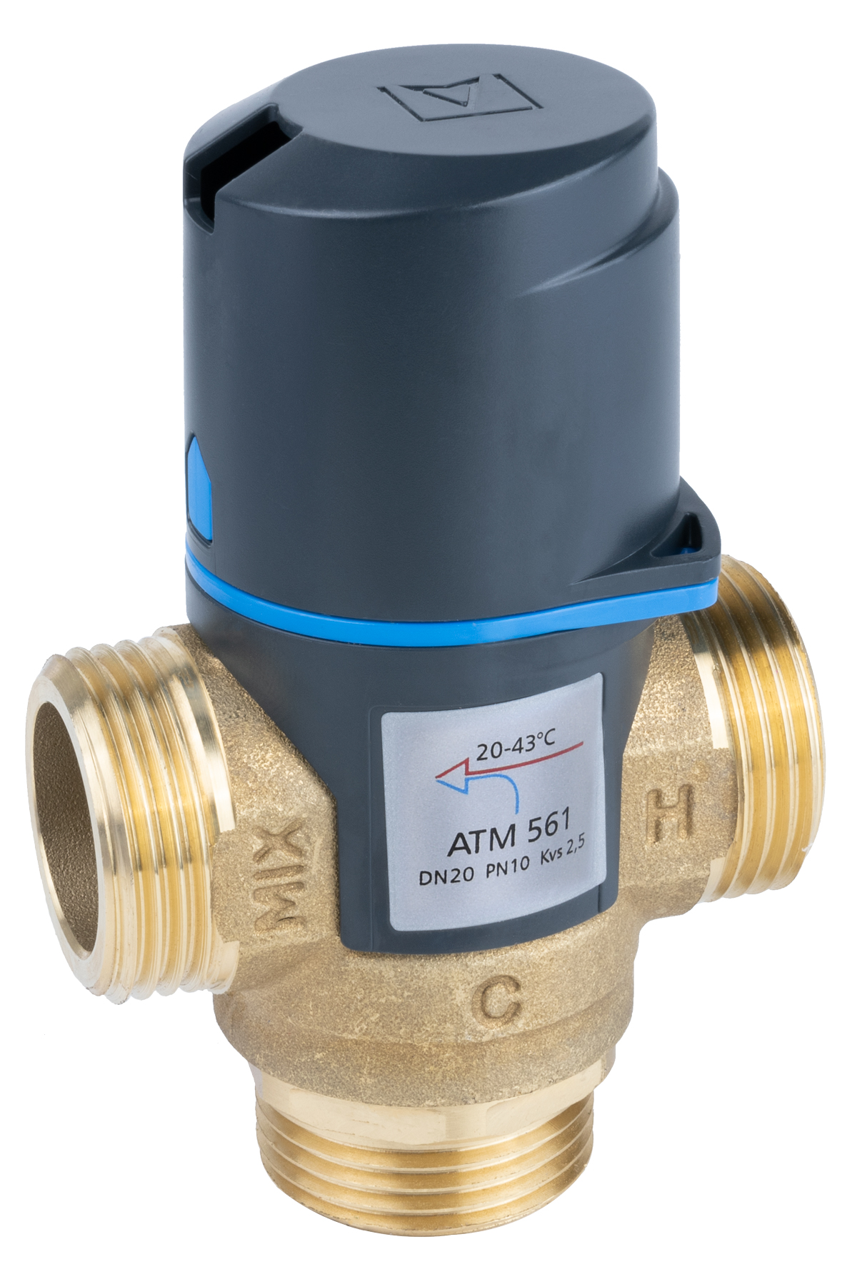 Zawór regulacyjny termostatyczny do wody ciepłej AFRISO ATM 561 ze śrubunkami mosiądz GZ 1'', DN 20, zakres temp. 20-43'C, Kvs 2.5 m3/h, maksymalna temperatura 90'C, maksymane ciśnienie 10 bar
