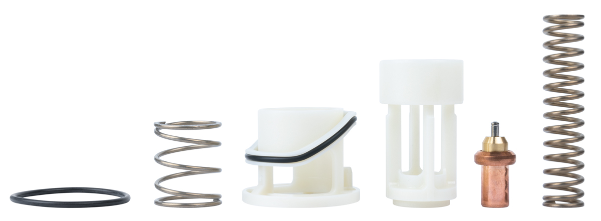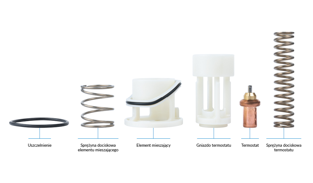 W skład zestawu wchodzą: uszczelnienie, dwie sprężyny dociskowe, wkładka termostatyczna, element mieszający i gniazdo termostatu.