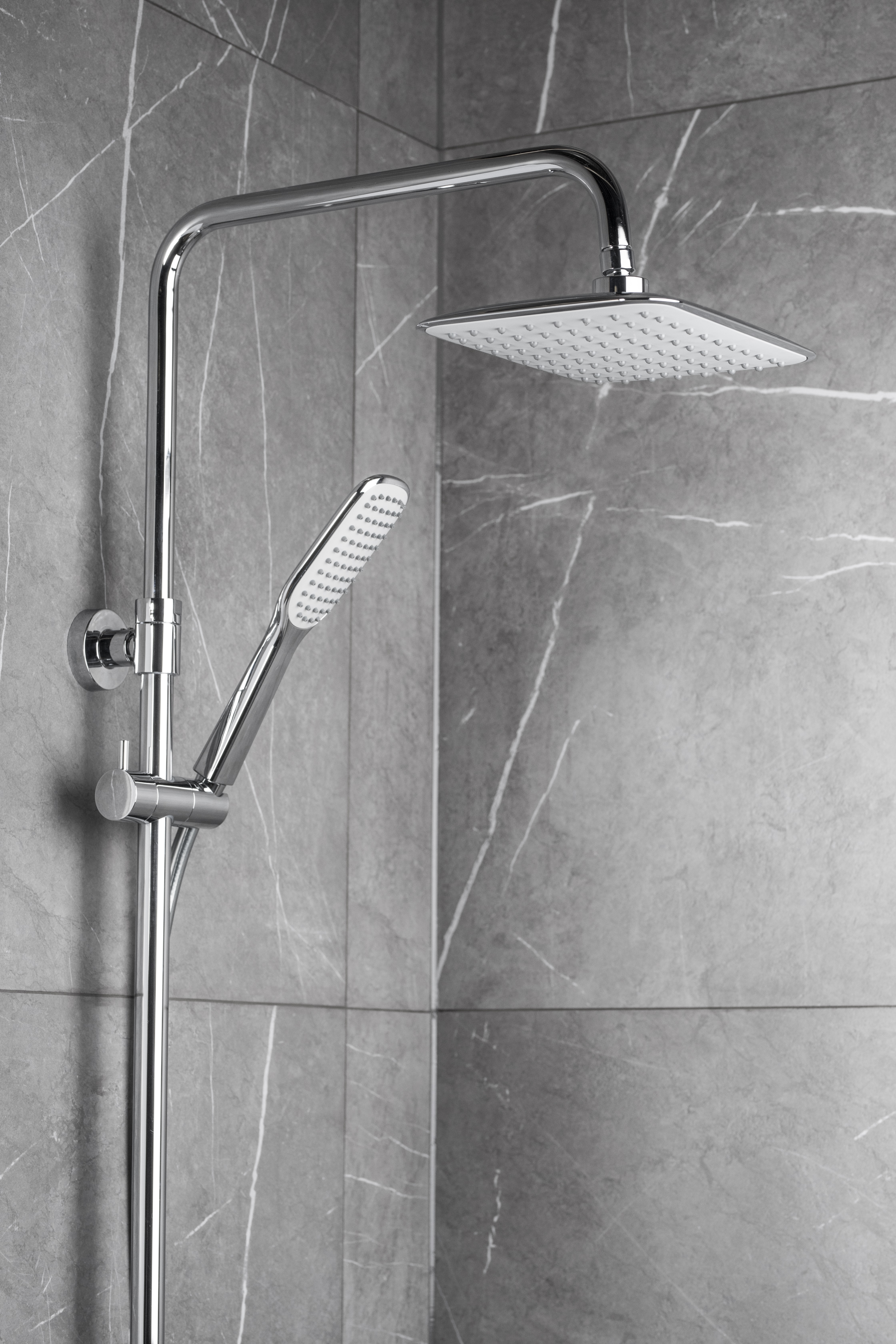 Warto zwrócić uwagę na kształty w deszczowni – prostokątny dysk kolekcji Logon to optymalny rozkład strumienia wody nad wanną, a przełącznik natrysku jest ergonomiczny, bo dzięki kubicznej formie nie ślizga się w mokrej dłoni.