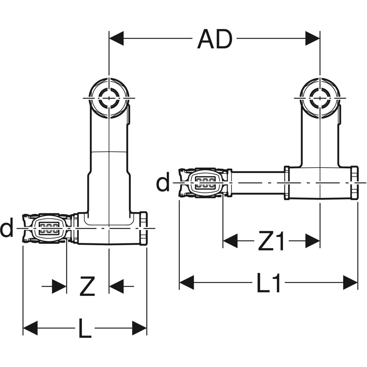 Zestaw trójników przyłączeniowych do zasilania i powrotu z grzejnika Geberit FlowFit, ze śrubunkiem przyłączeniowym do Euroconus, lewa strona